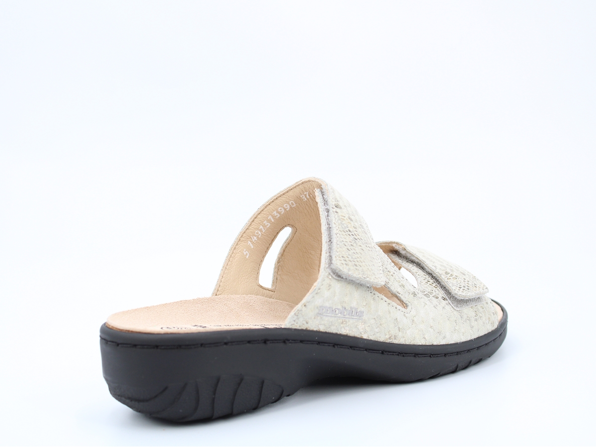 Femme Sandales Metallique Cuir Impression Reptile. Pratique et confortable, cette mule vous accompagnera aussi bien au quotidien que lors de vos occasions plus habillées. La semelle intérieure amovible qui intègre la SOFT-AIR Technologie et le SHOCK-ABSORBER, présent dans la semelle, contribuent à réduire les chocs au minimum pour une marche souple et sans fatigue. Le MATELASSAGE INTÉGRAL, un rembourrage exceptionnel entre la doublure et le cuir naturel, assure un confort optimal en enveloppant vos pieds et en évitant qu'ils se trouvent comprimés dans la chaussure. Les brides auto-agrippantes ajustables assurent un chaussant parfait. La doublure en cuir assure une hygiène saine du pied. Mobil's Marque de Méphisto, elle se distingue par son confort. Tous les modèles sont réalisés avec un matelassage intégrale et des techniques spéciales pour l'amortissement des chocs. De plus l'atout principale de la marques reste les semelles amovibles, que l'on retrouve dans tous les modèles Mobil's, de la bottine à la sandale.