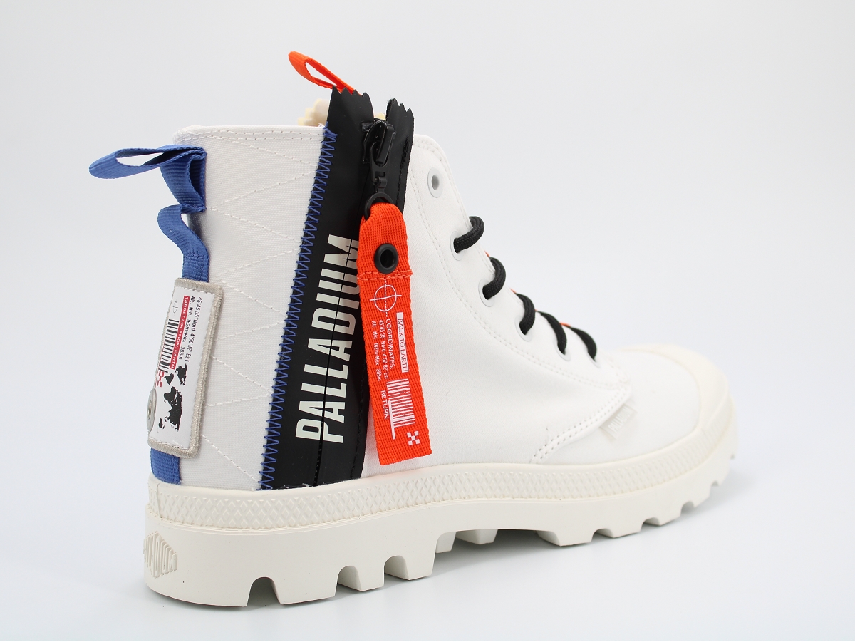TIGE : Moleskine en coton sur la claque et les quartiers, languette et talon en nylon DOUBLURE : 100 % polyester SEMELLE INTÉRIEURE : EVA découpée, surface en polyester SEMELLE EXTÉRIEURE : caoutchouc + EVA découpée MARQUE : Étiquette tissée sur la languette, étiquette tissée sur le quartier, logo imprimé sur le zip, patch rond en caoutchouc sur le quartier interne CARACTÉRISTIQUES : Lacets ronds, languette rembourrée, œillets, zip sur le quartier latéral, boucle au talon, boucle sur la languette et passants pour lacets PALLADIUM Crée initialement pour la fabrication de pneus d'aviation, la méthode de façonnage du caoutchouc a fait de Palladium un fournisseur de pneus essentiel. C'est après l'impact désastreux de la seconde guerre mondiale qu'en 1947 une usine est réouverte afin de produire des chaussures, pour hommes et femmes, utilisant le même savoir-faire. La résistance incroyable des semelles font de la marque le distributeur officiel de la légion étrangère française. Aujourd'hui encore sa qualité et son authenticité font de Palladium un incontournable.