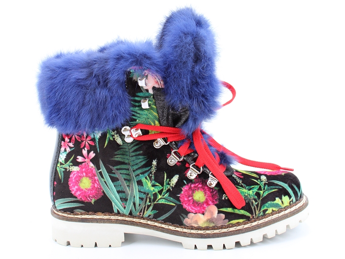 Bottine en velours imprimé floral multicolore doux, col en fourrure bleu.Pour le plus grand confort de votre pied, la doublure est en tissu chaud et la semelle intérieure en pure laine.La semelle est en caoutchouc et sa hauteur est de 3 cm. Les plus: étanche, look, originalité, qualité New Italia Cette magnifique marque de chaussures Italiennes fut créée en 1986 pour les intempéries hivernaux. De part son élégance et son originalité, elle a su se démarquer et s'imposer dans les stations de ski. Les choix pointilleux de ses matières et des différents cuirs sont un gage de qualité.